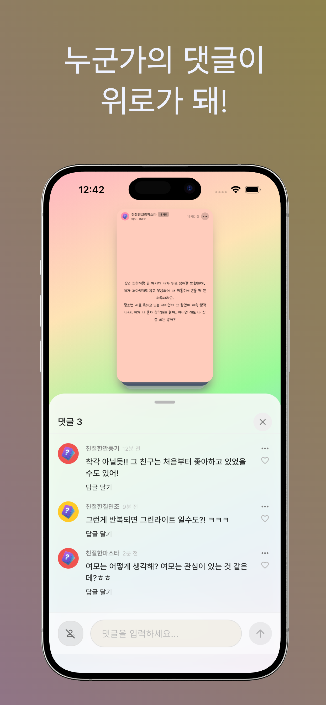 가까운 지인에게는 오히려 "너 또 그러냐?"라는 핀잔을 들을까 봐 겁날 때가 있죠. 나를 모르는 반모 친구에게 "나 오늘 너무 힘들었어, 위로 좀 해줘"라고 말해보세요. 의외의 따뜻한 반말 위로가 큰 힘이 됩니다.